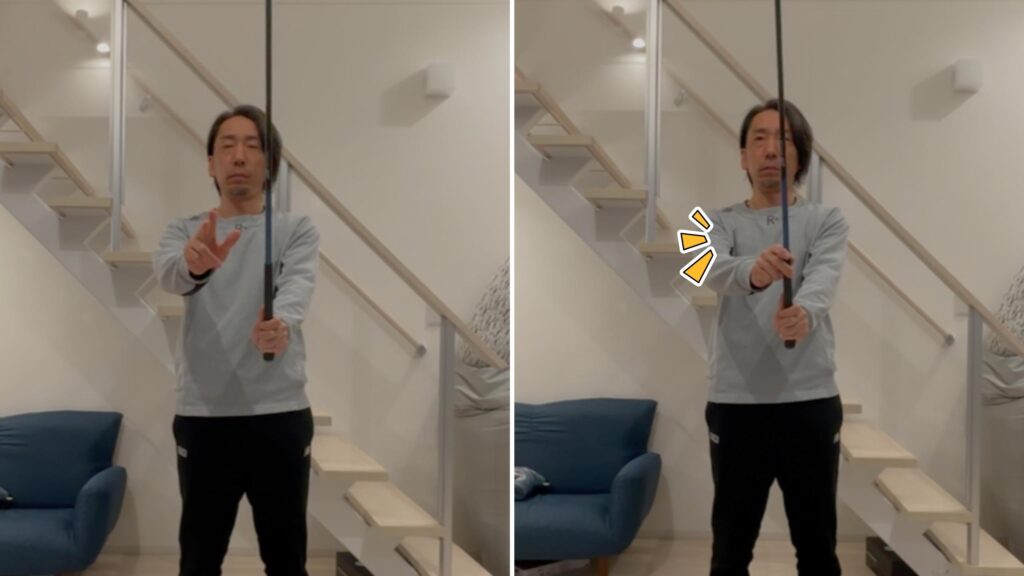 スプリットで握ってるから、「カクッ、カクッ」ってなるはず!