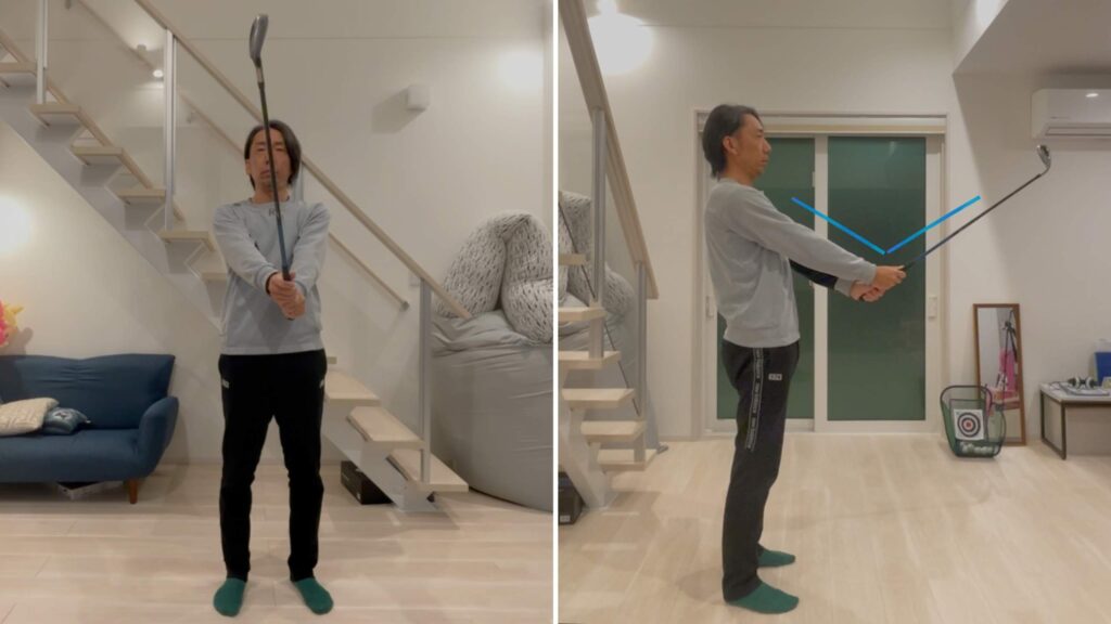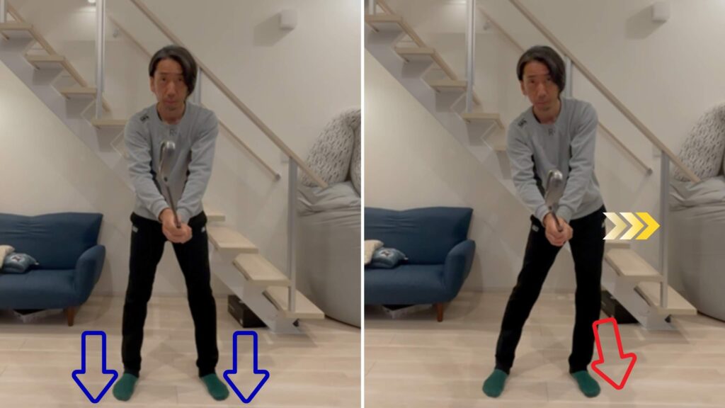 脱力して回し続けると、切り返しらへんでクラブが寝て、右足の前でグリンッ!と前にヘッドが出てくるような感覚があるはず!