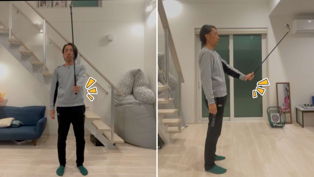 ①まず、みぞおち辺りでおもむろにクラブを立てて握ります