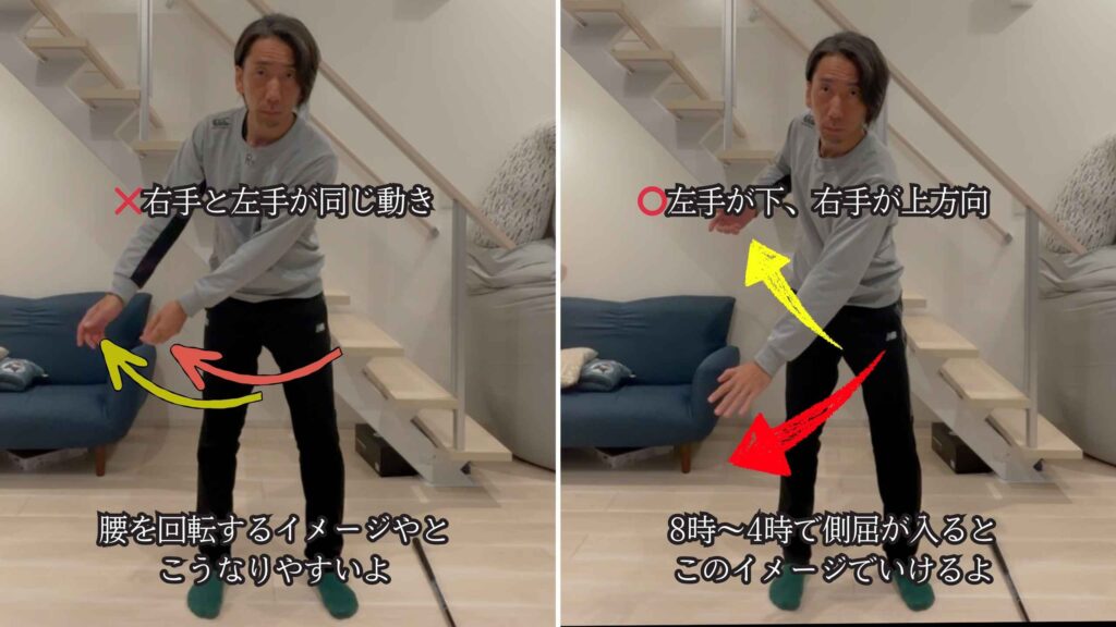 ちなみにこれは、前回の記事の「8時~4時での側屈の動作」がある程度できてるっていう前提になるからね!