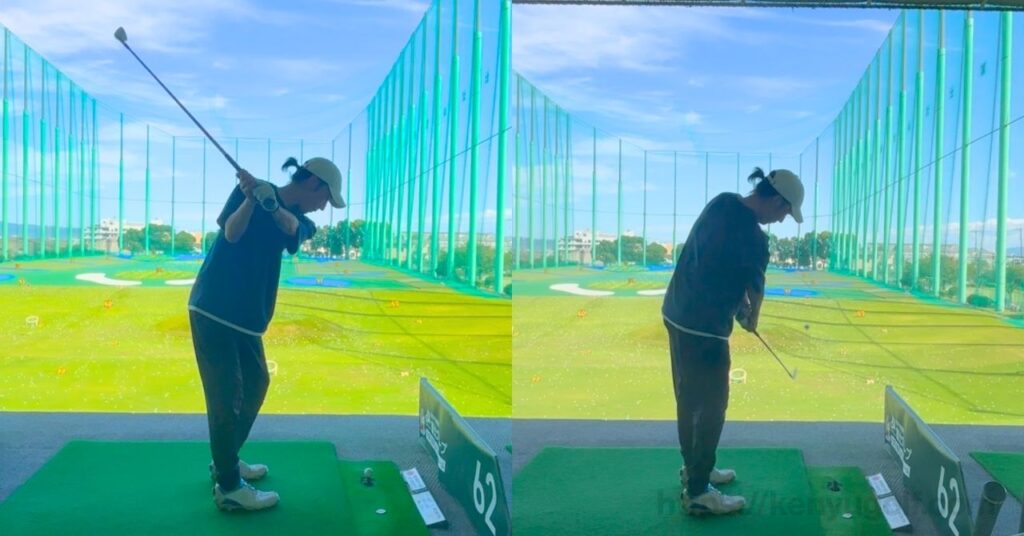 「ハーフスイングでも飛ばそう」と思った瞬間、腕が固まり、クラブは開き、軌道は上から入ります。