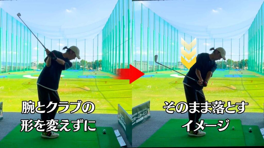 手で打とうとすると上から入りやすいので、重力で“クラブを落とす”ように下ろしてくる。