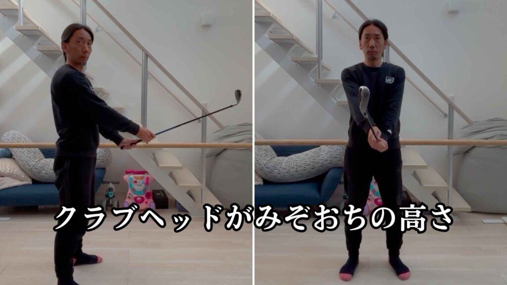 ①ヘッドがみぞおちの高さに来るように構える。だいたいでいいよ