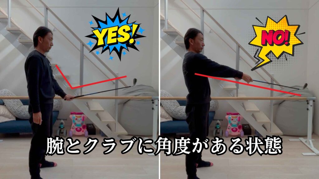 ②腕とクラブに角度がある状態で構える。少しでいいよ