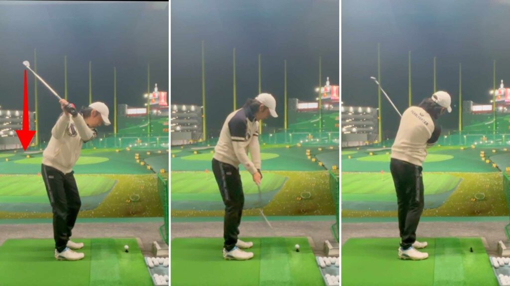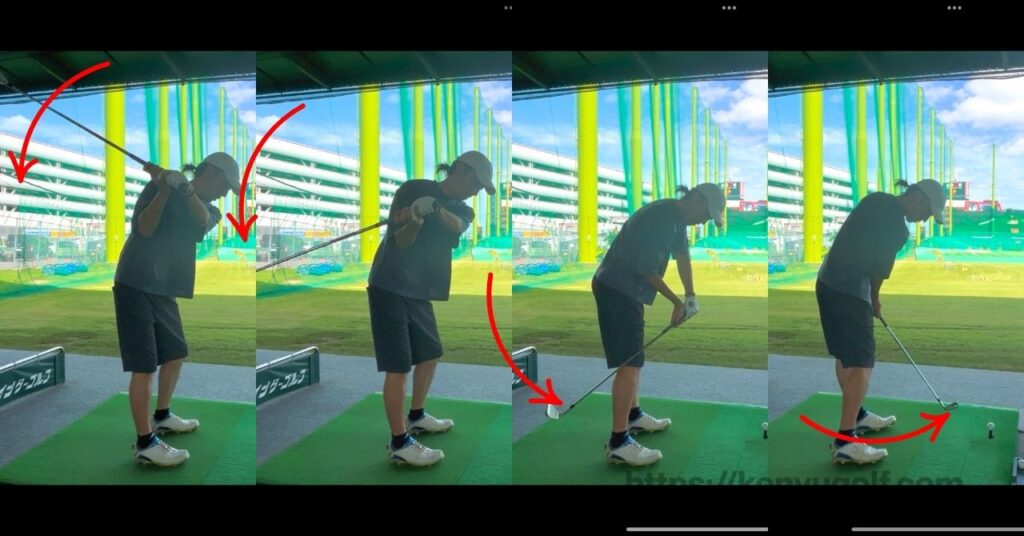 ヘッドをインサイドに引きすぎて、トップからインパクトにかけて逆のループがかかってしまうといった状態です。