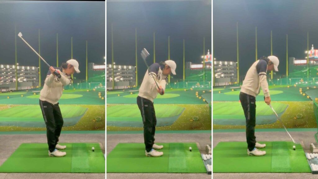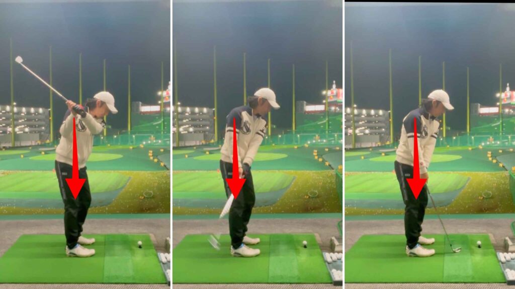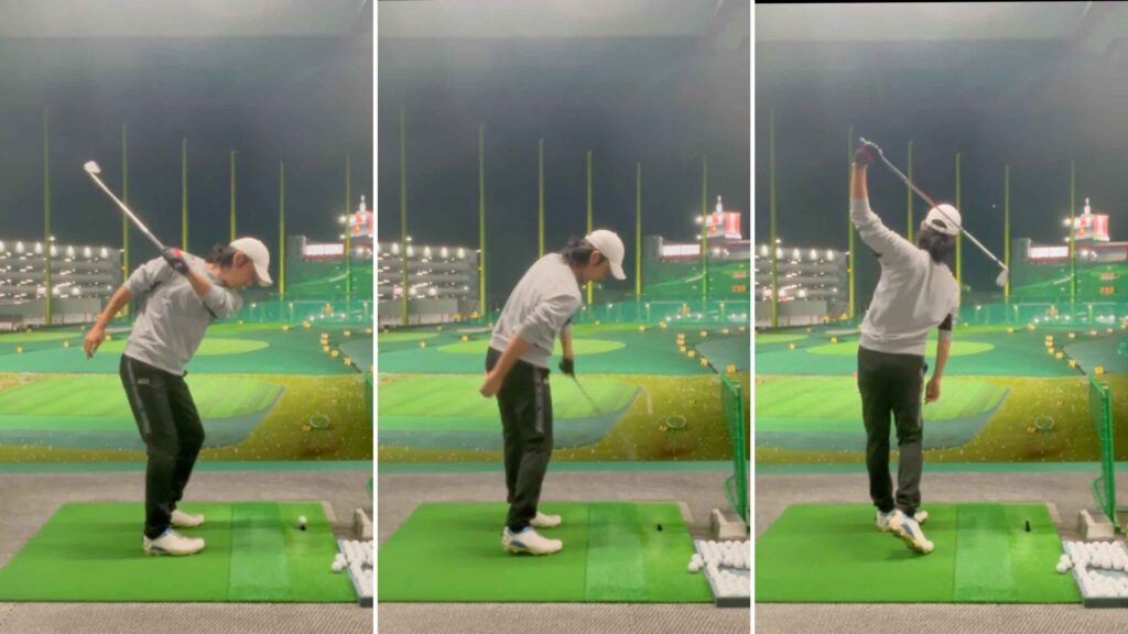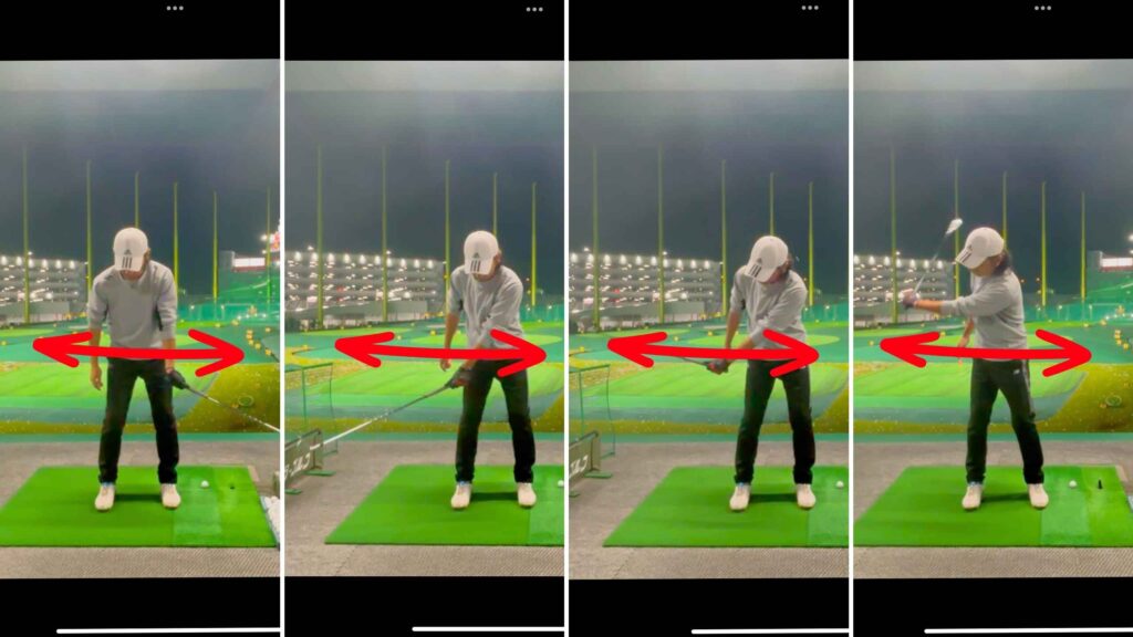 そしたらその状態から、左右に体を揺らし、その勢いでヘッドが上がる状況を作ってあげてそのまま振っていきましょう。