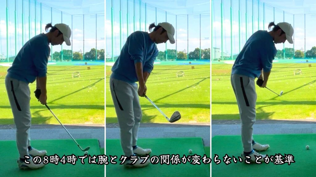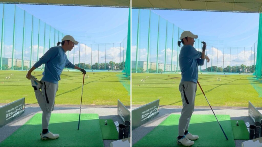 クラブが体の右側で立ってくる感覚であったり、腕のローテーションっていうのを観察してみてください。これもオススメの練習となります。