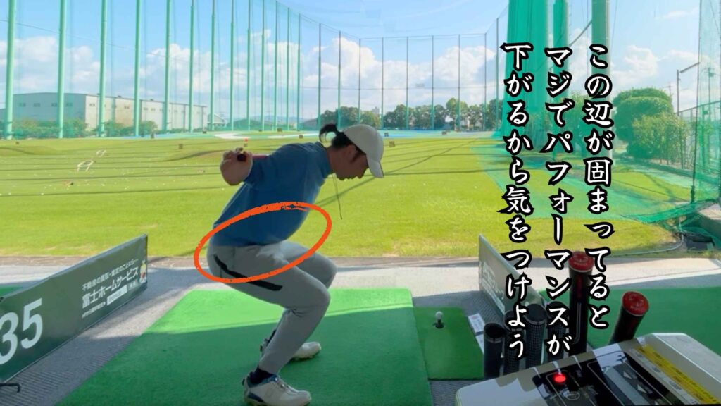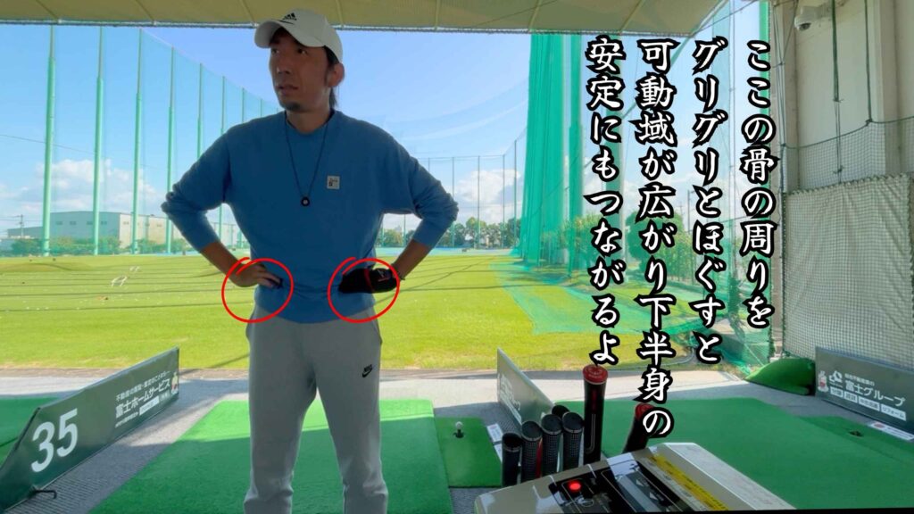 股関節の柔軟性がスイングではすごい重要になるので、骨盤周りの箇所を中心にずっとほぐしていくようにします。